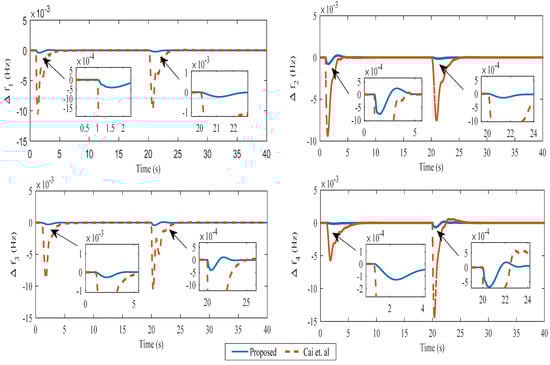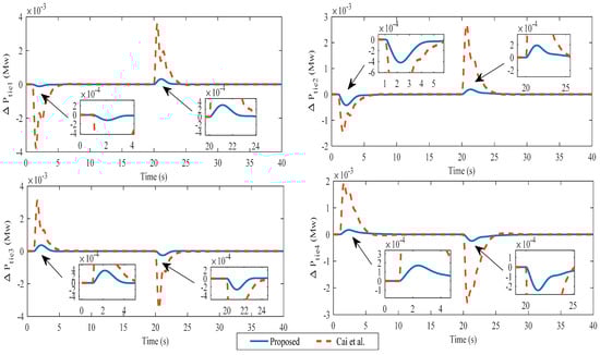 The step-change in load is () for areas 1 and 3 at t = 0 s and t = 20 s, respectively. From a critical analysis of Figure 27, it was observed that the proposed controller via the 2DoF-IMC technique has better frequency regulation in each area compared with Cai et al. []. Figure 28 confirms that the proposed controller has a faster response in tie-line power exchange between other areas and its controller performance is much better than Cai at al. []. Obviously, the proposed PD controller outperforms Cai et al. [].