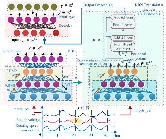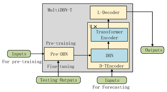 The overall structure of the MultiDBN-T model and its training process are shown in Figure 1. The training process steps are as follows. (1) It pre-trains with pre-DBN using the training dataset, and then uses the corresponding data for fine-tuning to obtain the optimized DBN. (2) The training dataset will be directly inputted into the tuned DBN in the D-TEncoder, and be further encoded by the transformer encoder. (3) Finally, the L-Decoder is used to decode and calculate the loss function, and the final prediction model is obtained through the back-propagation gradient calculation and optimization of the neural network.