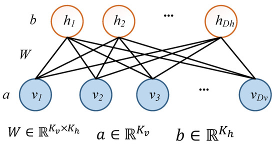 In each RBM, the dimension of an observable variable is , and the dimension of a hidden variable is ; that is, and . The bias of an observable variable in the visible layer is , and the bias of a hidden layer variable is . The weight matrix between the two layers is . is the bias of , is the bias of , and is the weight of the edge between and .