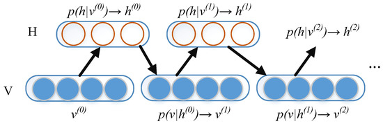 As displayed in Figure 4, in the solving process of the CK-k algorithm, for the original data of a given observable variable, the hidden vector is obtained by sampling the conditional probability . Next, is used to calculate the conditional probability and to obtain by sampling. The process is repeated to obtain and . According to the aforementioned process, Equations (1)–(3) and the calculation formulas of and , the equations for updating the parameters , , and for GG-RBM are follows: