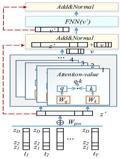 Figure 5 displays a multi-head self-attention encoder. During encoding, through multiple learnable matrices , and , the self-attention model is applied in projection spaces. The query, keys, and values in the projection spaces can be calculated as follows: