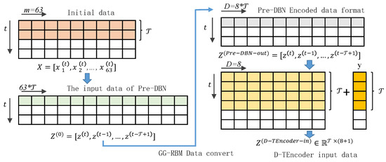 (1) Initialization of the original data format to the model input format: As displayed in the left part of Figure 5, after the initial data are cleansed, their format is an array . According to the format of pre-DBN input in MultiDBN-T, the data of consecutive durations (, that is, hours, rows of records, are converted into one-dimensional array data.