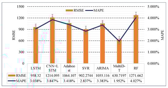 Table 4 and Figure 7 reveal that MultiDBN-T (abbreviated as MultiD-T in the figure), the proposed forecasting model, outperforms all the compared algorithms in terms of MAPE (1.952%) and RMSE (630.720 KW) of the prediction results in the test set. RF exhibited the worst performance, with MAPE and RMSE of 4.027% and 1271.662 KW, respectively. Among the algorithms involved in the comparison, the comparison between the best, MultiDBN-T, and the worst, RF, reveals that the MAPE and RMSE of the proposed forecasting model were 51.54% and 50.40% higher than RF, respectively.