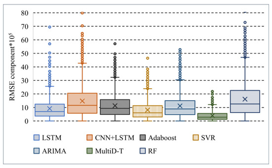 It can be seen from Table 6 and Figure 9 that the values of MAX, Q1, MEDIAN, Q2, and Q3 of the RMSE component of the MultiDBN-T model are still the lowest among all methods.