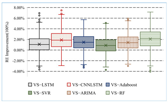 Figure 10 and Figure 11 reveal that except for the versus SVR, the upper and lower quartiles of and improved by MultiDBN-T and the several other algorithms were all above 0. Thus, the performance of MultiDBN-T at each observation point of the test set was the best. In particular, the lower whiskers of each box plot on are short and mainly distributed above the lower quartile line, and the lower quartile line is above 0. Therefore, the performance improvement of the forecasting model in this paper on is remarkable and stable.