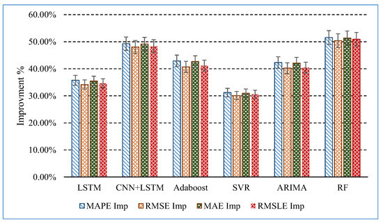 It can be seen from Table 7 and Figure 10 that the MultiDBN-T model has the most obvious improvement in the MAPE component compared with the RF method; the improvement is not obvious compared with the SVR method, but its component improvement reached an average of 0.89%. From Table 8 and Figure 11, it can be seen that the situation of the RMSE component improvement is similar to that of the MAPE component improvement.