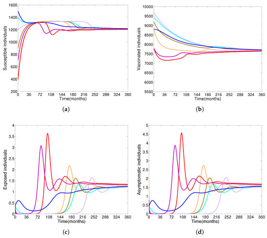 Due to the rate of vaccination being most sensitive to , the effect of on diphtheria prevalence then is explored with various . With the baseline model parameter values in Table 1, the critical value of vaccination rate for diphtheria elimination is (see (22)), which corresponds to the threshold vaccination coverage level for diphtheria eradication (see (21)). In the following, numerical simulations are illustrated for and , respectively.