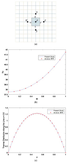 (a) Control volume domain at a specific mesh point P. (b) Comparison of our numerical results for the Nusselt number Nu with literature Ali et al. [17], for the limiting case. (c) Comparison of our numerical results along the line x = 0.5 with the literature Ali et al. [17], for the limiting case. (d) Comparison of our numerical results along the line y = 0.5 with the literature Ali et al. [17], for the limiting case.