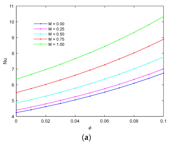 Further, Figure 3a,b are referred in order to obtain a further insight into the dependence of the Nusselt number Nu on different governing parameters. Obviously, there is a significant increase in Nu irrespective of the strength of the magnetic field produced by the dipole (please see Figure 3a).