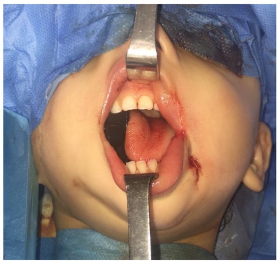 - Rao, S.; Oak, S.; Wagh, M.; Kulkarni, B. Congenital midline palatomandibular bony fusion with a mandibular cleft and a bifid tongue. Br. J. Plast. Surg. 1997, 50, 139–141. [Google Scholar] [CrossRef]