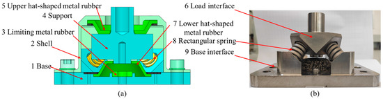 Vibration isolators are widely used to suppress the effect of unwanted vibrations on equipment and components [1,2]. Passive vibration isolation does not have an external energy supply, and it has the advantages of simple structure, high reliability, low cost, and a remarkable high-frequency vibration suppression effect [3], so passive vibration isolation is widely used for vibration suppression in many areas, such as spacecraft [4], vehicle seats [5], vessels [6], and high-accuracy equipment. Some efforts have been made regarding the development and innovation of passive vibration isolation for this purpose. In addition, many vibration isolators and systems with innovative structures have been developed to achieve passive vibration isolation; these include the wipe rope isolator [7], spring vibration isolator [8], metal rubber vibration isolator [9,10], and pipeline bracket system [11]. Although the abovementioned vibration isolators have characteristics of a good damping effect or stiffness that meets the requirements, they do not meet the dual requirements of suitable stiffness and excellent damping ability at the same time. To solve the dilemma discussed above, the work proposes an all-metallic vibration isolator (AM-VI) whose key elements are composed of four rectangular springs and hat-shaped metal rubber.