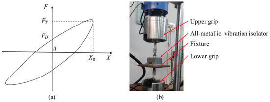 When the elliptic method was conducted to perform the dynamic test, the dynamic stiffness and loss factor were computed on the basis of the transmission force-displacement curve that was obtained. As shown in Figure 3a, X0 is the displacement’s amplitude and the maximum value in the elliptic curve’s X coordinate. FT is the elastic force amplitude and the corresponding transmission force when the displacement is the maximum X0. FD is the maximum damping force, namely the transmission force when the displacement is zero. The main components of the dynamic testing apparatus were a computer, a controller, and a dynamic testing machine with a force sensor positioned on top of the upper grip. A schematic representation of the vibration isolator dynamic test is shown in Figure 3b. It should be noted that before the test started, the vertical load rating of the AM-VI was preloaded by the testing machine to guarantee that the AM-VI was always under pressure during the test.