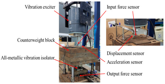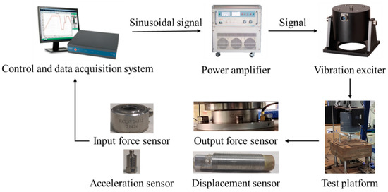 A frequency sweeping test was also applied to investigate the dynamic performance of the AM-VI. The experimental equipment and system for the frequency sweeping test are shown in Figure 4. The constructed test platform is displayed in Figure 5. Constant force excitation can be used to test an AM-VI’s dynamic performance, and mechanical impedance and force transmissibility can be obtained by computation. As depicted in Figure 5, when dynamic stiffness and loss factor are measured, a force sensor and a displacement sensor were used. Similarly, when mechanical impedance and force transmissibility were measured, a force sensor and an acceleration sensor were utilized. The test platform was excited with a 10 N constant force sweeping throughout a frequency range of 5 Hz to 1000 Hz, and the attached counterweight was 198 kg.