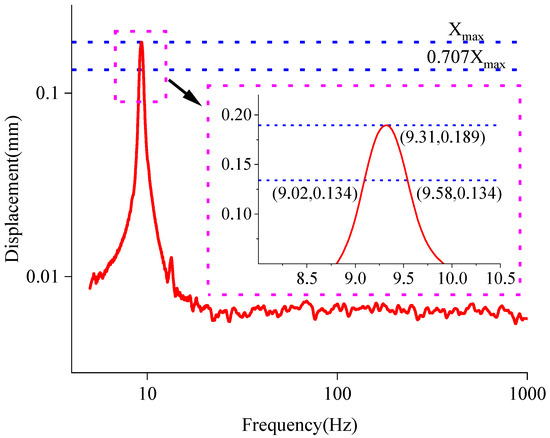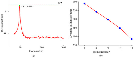 We performed investigations into how the elliptic method and the frequency sweeping method affected the dynamic stiffness of the AM-VI. Figure 7a displays the displacement-frequency response curve acquired by the frequency sweeping method. According to vibration theory, a system with one degree of freedom vibrates in a single, one-order mode. Figure 7a shows that the displacement–frequency response curve only exhibits the first-order modal, verifying the accuracy of the experimental result. The results reveal that the tested system’s resonance frequency was 9.31 Hz, and the dynamic stiffness of the AM-VI was calculated to be 677.52 N/mm by putting the weight mass and resonant frequency of the tested system into Equation (8).