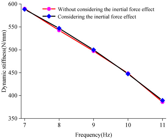 Since the test system’s actual load was slightly smaller than its rating load, the resonant frequency of the AM-VI was slightly larger for the frequency sweeping testing. Similar to the results above, a large difference was found between the dynamic stiffness predicted by Equation (8) and the actual dynamic stiffness because the test system’s load was slightly lower than the rated load. The rated load of the AM-VI was applied by the dynamic testing machine for elliptic dynamic testing. Considering the force sensor‘s position on the dynamic testing machine and the fact that the force sensor recorded data that included the machine’s inertial force, it is crucial to think about how the inertial force effect affects the dynamic stiffness. Comparing the experimental results obtained by considering the inertial force effect of the dynamic testing machine, the relationship between the dynamic stiffness and the excitation frequency is shown in Figure 8. The dynamic stiffness of the AM-VI without considering the inertial force effect was obtained by the dynamic test of the elliptic method. The dynamic stiffness of the AM-VI considering the inertial force effect was obtained by bringing the experimental data into Equation (7) and then fitting it with MATLAB. The inertial mass of the AM-VI was determined to be 70 kg by fitting. It can be seen that regardless of whether the inertial force effect of the dynamic testing machine was considered, the dynamic stiffness had the same tendency, and both decreased with an increase in excitation frequency. The corresponding dynamic stiffness parameters are listed in Table 7.