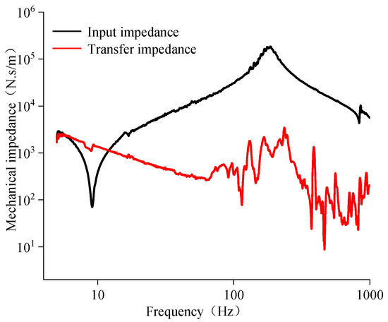 Because the counterweight and the input force sensor were threaded fixed, and the force sensor was fixed with a threaded rod and the vibration exciter, the dynamic force Fz1 at the AM-VI’s input can be viewed as the excitation force of the vibration exciter. The mechanical impedance curve of the tested AM-VI is shown in Figure 10. The mechanical impedance curve in Figure 10 shows that the AM-VI has excellent vibration isolator performance to a great extent.