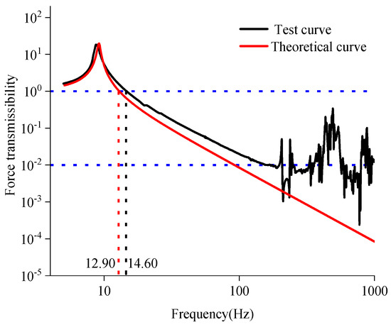 The force transmissibility was calculated to further evaluate the vibration isolation performance of the AM-VI, as shown in Figure 11. It can be seen that the force transmissibility was greater than 1 when the excitation frequency was less than 14.60 Hz, which indicates the vibration amplification of the AM-VI in the low-frequency band. The AM-VI gradually started to perform its vibration isolation effect as the frequency increased. It also can be noted that the force transmissibility was less than 1 when the excitation frequency was more than 14.60 Hz, which means that the AM-VI was beginning to exert its vibration isolation effect. The theoretical and experimental curves of the force transmissibility had the same trend within 100 Hz, and their values were relatively close. It can be seen in Figure 11 that the actual resonant frequency was offset from the theoretical resonant frequency to the low frequency, and the initial frequency of vibration isolation measured by the test was slightly larger than the initial frequency of theoretical vibration isolation. The cause of the abovementioned results may be the manufactured and installed error of the AM-VI and the experimental error of the test. With the excitation frequency exceeding 100 Hz, the experimental curve of the force transmissibility showed an oscillating trend. It was different from the downward trend of the theoretical curve. This discrepancy may be due to the test conditions. The force transmissibility reached 0.01 with the increase in the excitation frequency, which indicates excellent vibration isolator performance of the AM-VI within a wide frequency range. The isolator with nonlinear damping had better vibration isolation performance than the isolator with linear damping at high frequencies [27,28]. The metal rubber damping element of the AM-VI is a type of nonlinear damping material [21], and the force transmissibility shows that the AM-VI has excellent vibration isolation performance within a broad frequency. This demonstrates the validity of previous research to some extent.