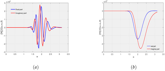 Example 1. Consider the wavelet function . Then, we shall compute the quadratic-phase wave packet transform (5) of the function with respect to an analyzing function as: It is immediate from (10) that the quadratic-phase wave packet transform (4) can be visualized as a three-parameter representation of a signal . Simultaneous visualization of quadratic-phase wave packet transform in all three variables is hardly possible. Hence, in order to have a sound visualization, some variables must either be fixed or eliminated, so that one is restricted to a particular section of the parameter space determined by . - (i).