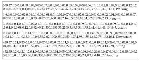 In a traditional indoor HAR system, features are commonly extracted from time-series sensor data by using statistical methods such as max, min, mean, peak-to-peak value, standard deviation, the number of zero crossings, skewness, kurtosis, and entropy. However, this input data cannot be interpretable by humans, as can be seen in Figure 2. For humans, the numerical values such as in Figure 2 cannot be matched with the activities. For instance, when the numeric feature vector [339, 27, 0.3, 0.4, 0.08, 0.06, 0.05, 0.07, …] is seen by a human, it cannot be directly associated with the “walking” activity since it lacks visual representation.