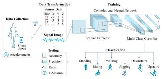Figure 4 shows a general overview of the proposed HARSI approach. The approach mainly includes the following stages: data collection, data transformation, training, testing, and classification. (i) The data collection stage comprises obtaining raw signal values via an accelerometer sensor available in an IoT environment when performing human actions. After that, the collected raw data are transferred to a server through WiFi communication technology. (ii) In the data transformation stage, the time-series signal data are divided into fixed-size segments, called windows, by using a sliding-window method. After that, an image is generated for each window by drawing lines on sample values. Here, each signal image corresponds to a single activity such as standing, sitting, or walking. (iii) In the training stage, each signal image is fed to CNN as an input vector, and then CNN learns different features of the image through different layers. (iv) In the classification stage, the CNN model gives insight according to the features of the signal image. In other words, the CNN model makes a prediction for a given input image according to the class probabilities of activities, such as standing, sitting, jogging, walking, moving downstairs, and moving upstairs. (v) In the testing stage, the performance of the CNN model is assessed by using a test set to evaluate how well it recognizes human activities. If the prediction accuracy of the CNN model is at an acceptable level (i.e., >80%), it can be further used to recognize real-time human activities. Afterward, the final prediction can be considered in a decision support stage to provide guidance to the decision-maker. Since the indoor environment of HAR systems is dynamic and ever-evolving, it is required to update the model periodically by following the same stages to achieve high accuracy consistently.
