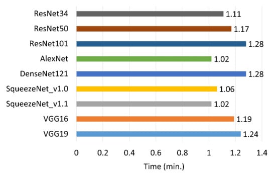 One of the main differences between the CNN models is the number of parameters, which can reflect the computational complexity of the model. It may be noted that as the number of total parameters increases, the time required for training usually increases. There are two categories of parameters: one is trainable parameters (i.e., weights of connections between layers) that are continuously updated to reduce the loss, and the other one is nontrainable parameters (i.e., biases) that are not optimized during the training process. For instance, in VGG19 architecture, the number of trainable parameters is 541,440, while the number of nontrainable parameters is approximately 20 million. As seen in Table 2, SqueezeNet has the smallest total number of parameters, whilst ResNet101 has the largest. The architectures have approximately 2, 15, and 25 million parameters for AlexNet, VGG16, and ResNet50, respectively. These values may be associated with computational complexity, where the higher the number of parameters, the greater the computational load during the training process.