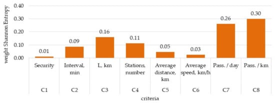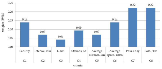 - C2–Average headways, min. This criterion indicates the level of the passenger’s service.