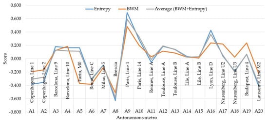 The novelty of the proposed evaluation and its main contribution is presented by determination of groups of symmetrical autonomous metro lines; integration of different multi-criteria methods into an aggregative approach, which ranks the alternatives and assesses the criteria. The output of the different multi-criteria methods serves as an input to an aggregated system for decision making.