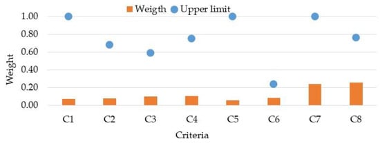 The methodology of BWM (Best Worst method) is based on a pairwise comparison of the decision criteria, [,]. The decision maker selects two criteria: the best criterion and the worst criterion. The best criterion is the most important according to the opinion of the decision maker. The worst criterion is the least important. The experts use a predefined scale of pairwise comparison, including the numbers from 1 to 9 to determine the preference of the best criterion over all the other criteria and the preference of each of the other criteria over the worst criterion. The scores are, as follows [,]: equally important (1); equal to moderately more important (2); moderately more important (3); moderately to strongly important (4); strongly more important (5); strongly to very strongly important (6); very strongly more important (7); very strongly to extremely more important (8); extremely more important (9). The score of 1 shows some importance. The value 9 presents the extreme importance.