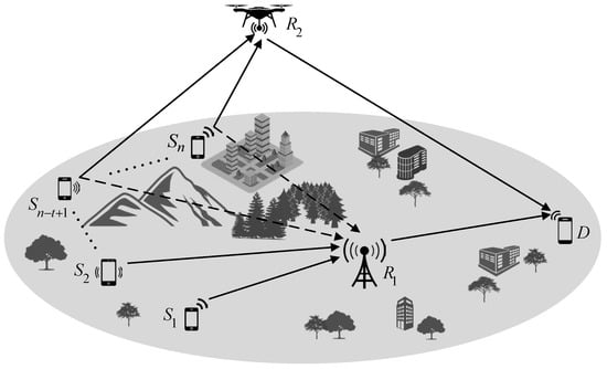 We consider a communication system based on multiple-access relay networks, as shown in Figure 1. Multiple users transmit information to destination via a common relay . We assume that the channel conditions of the source-relay links between and sources deteriorate dramatically due to obstacles blocking or unexpected damage to the links. In this situation, traditional distributed networks can no longer provide reliable and efficient transmissions. We propose a novel multiple-access multiple-relay network by introducing an additional relay node in a distributed network. The additional relay can be regarded as a cooperative relay to provide enhanced access to certain sources with poor channel conditions. As can be seen from Figure 1, the additional relay is a mobile relay in contrast to a traditional static fixed relay, which can be implemented using drones. It can move to the appropriate locations where the sources with poor link conditions to ensure all sources can be accessed. By making use of a drone as a cooperative relay, this network can provide an additional degree of freedom in terms of movement. As a result, the coverage of the relays can be extended, and the transmission efficiency and reliability of the network can be improved.
