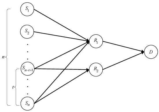Multi-access single-relay networks are typical access networks frequently used in multi-user communications. They generally consist of multiple source nodes, a single relay node, and a single destination node, also known as distributed networks [1,2,3]. Each source node connects to a common relay node and communicates with the destination node through it. Fountain coding for distributed networks can be represented by two-layer concatenated fountain codes. Firstly, each source node performs the first-layer fountain coding on its original information symbols according to the degree distribution, and then sends them to the relay node. Secondly, the relay node performs the second-layer fountain coding by using the network coding method and sends the encoded symbols to the destination node, rather than simply amplifying and forwarding. Finally, at the destination node, the overall degree distribution of the received symbols can be considered a composite function of the degree distributions of the two-layer fountain codes [4,5]. With a carefully designed overall degree distribution, the destination node is guaranteed to be able to decode efficiently using a belief propagation (BP) decoder [6,7].