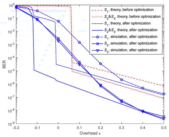 We now consider the simple case where no symbols are erased on each source-relay and relay-destination link. Figure 5 shows the theoretical asymptotic bit error rate (BER) performance before and after the optimization when the source number . Note that the theoretical BER of source and are identical since they have the same connection and the same degree distribution. As shown in Figure 5, it indicates that after the optimization, the BER performance is improved significantly, which verifies the effectiveness of the optimization. For example, when the overall overhead , the BER of is approximately 1/3 of that before optimization and the BER of and is approximately 1/20 of that before optimization. Furthermore, we compare the theoretical BER with the simulated finite-length BER of using optimized degree distributions for in Table 1. It reveals that the simulated BER is consistent with asymptotic BER as the code overhead increases, which verifies the correctness of the optimization method in Section 5. In addition, Figure 5 shows that the BER performance of sources connected to the cooperative relay is improved, whereby the UEP property is obtained by EDFC.