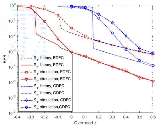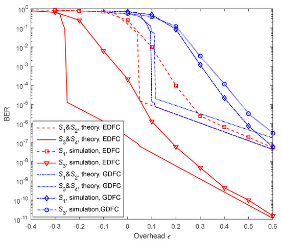 Figure 6 and Figure 7 compare the performance of EDFC with GDFC [5] in two-source and four-source networks, respectively. The optimized degree distributions in Table 1 are both used for simulations of these two coding schemes. In a four-source network, source and have similar performances, as do and . Therefore, for simplicity, we only plot the simulated BER curves for and in Figure 7. It reveals that EDFC outperforms GDFC both in two-source and four-source networks, and the performance benefit is not restricted to the sources connected to the cooperative relay but applies to all sources in the network. For example, in Figure 6, when the overall overhead , the BER of for EDFC is approximately 1/25 of that for GDFC, and the BER of for EDFC is approximately 1/150 of that for GDFC. The reason is that EDFC has an additional cooperative relay, which enhances the performance of the source connected to it. Moreover, as a result of the involvement of the cooperative relay, the number of output symbols with degree 1 grows in the Tanner graph, which can increase the decoding success rate of the Tanner graph. Thus, an improvement of the overall performance is obtained.