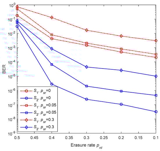 BER performance versus relay-destination erasure rate for EDFC with two sources.