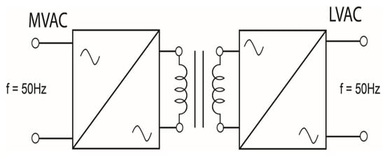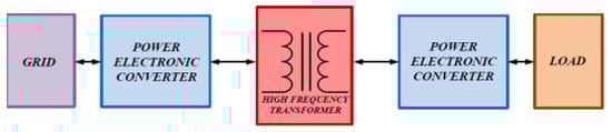 Over the past two decades, the SST has evolved rapidly, and it is now considered to be the most suitable and appropriate conversion device to replace the traditional prevailing transformer. In this device, the weight/volume savings, extensive efficiency enhancement and above all, the cost economization are taken to be the hallmarks. Several topologies, arrangements and uses of SST technology have been, and continue to be, anticipated and evaluated [1]. Conceptually, Figure 1 illustrates the basic concept diagram of the SST, which involves a combination of high-frequency transformer and power electronics components.