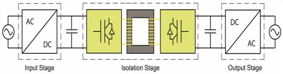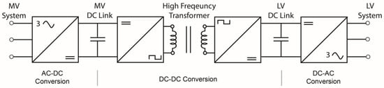 A three-stage structural design with two DC links, is the most workable, practical and realistic solution due to its high flexibility and control performance. It ensures numerous functions that are enviable when compared to SST functions. This configuration encompasses the conversion of AC voltage at the input to a corresponding DC voltage, resulting in a medium voltage direct current (MVDC) link. Then, this MVDC is processed to change into HF AC voltage, which is routed through to the medium-frequency transformer. At this stage, the voltage level is condensed, rectified once more to a low-voltage DC level and finally constitutes a low-voltage DC link. At a further stage, this obtained low-voltage direct current (LVDC) is transformed once more in order to achieve 50 Hz AC voltage. The diagrammatic representation of this topology with three distinct stages is illustrated in Figure 7. The MVDC is considered to be a viable one for renewable energy sources connected with SSTs [22].