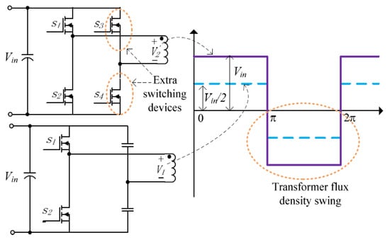 The literature survey emphasizes the importance of HB configuration in terms of output voltage, number of bridges, number of switches, etc. The advantages of the HB arrangement are as follows: (1) the output voltage is halved compared to the full bridge (FB) voltage requirement (i.e., step down), (2) the number of bridges required is halved as compared to the FB topology (3) the sufficient simplification of a power scheme layout, (4) the reduction in the complexity of control and protection circuitry, coupled with the reduced converter price [49,50,51,52,53].