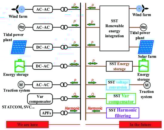To implement this technology in a befitting manner, tremendous efforts have been carried out to design and structure the SST and observe its impending application in the distribution system [123,124,125]. On one hand, Figure 11 depicts the customary distribution system, incorporating the transformer for integrating renewable energy resources & energy storage devices, operating the traction/locomotive system and interfacing the FACTs devices (e.g., the active power filters and reactive power compensator). On the other hand, this figure also highlights the anticipated impending SST-based distribution system. Therefore, it is evident that the SST can replace the traditional transformer when coupled with some power electronics with appropriate cohesive and dense system potentials. In addition, the efficiency and cost concerns of the SST may be tackled prudently. However, the consistency and lifetime of the SST-interfaced distribution system are of a great concern for the utilities [126,127,128,129,130,131,132,133,134,135,136,137,138].