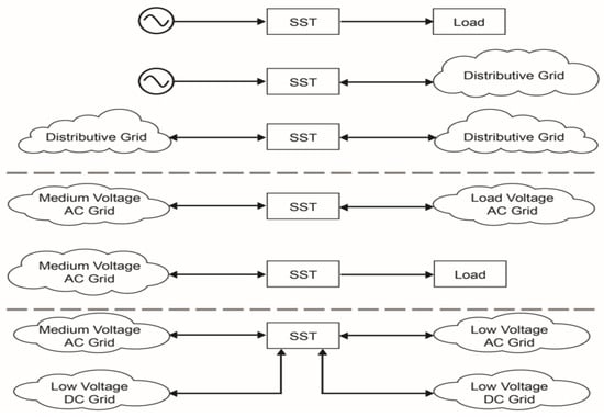 The applications and uses of the SST in certain spheres are much more striking and appealing [139]. Some examples of these applications include: (1) The locomotive and related traction system as a significant and momentous weight reduction mechanism; this results in the enhancement of efficiency and a reduction in EMC/harmonics (2) The desired energy generation as a means for cheaper offshore platforms. (3) Smart grid applications for the dynamic adjustment of energy distribution. (4) Integration with other energy systems. (5) Applications between generation sources and load/distribution grids to attain a unity power factor from energy transportation. (6) The controlling of active power between two distribution grids and action as a reactive power compensator for both grids. (7) Linkage between the MV and LV grid to control the amount of reactive power flow. (8) Action as an interface for distributed generation and smart grids [140,141,142,143]. Diverse applications/usages lead to different requirements. Figure 12 exhibits a schematic overview of SST applications [144,145,146,147,148].