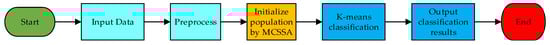 A complete flowchart diagram for the proposed system is presented in Figure 1. As illustrated in Figure 1, we need several steps to complete data classification. Data preprocessing is discussed in Section 3. This section focuses on how to use chaos sequences to improve the SSA algorithm and how to apply it in K-means.