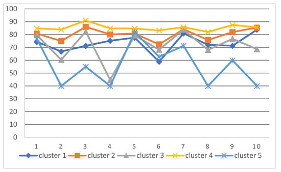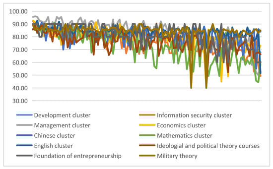 From Figure 8, it can be concluded that the clustering results can divide students into several categories according to their scores, and students in the same cluster have similar characteristics. The students in cluster 4 have excellent scores. The clustering centroids are at the forefront, and the results are relatively balanced. Their learning ability benefits them in every way, and they can choose their future employment path based on their interests. The students in cluster 2 have good scores. In the future, they can select management or information security jobs according to their interests. The students in cluster 1, cluster 3, and cluster 5 belong to the students with poor scores, and their course scores fluctuate considerably. The students of cluster 1 have a higher cluster center value in the economic and banking courses, and they can choose banking and financial work as their employment direction. The peak scores of students in cluster 3 are in management courses, so they have great potential in management courses. The students of cluster 5 only have the cluster center value close to other clusters in the development courses. If they can learn deeply in the development courses, they can narrow the gap with others and experience core competitiveness when looking for jobs in the future. Cluster 5 has courses with a cluster center value of 40. Such students need to correct their learning attitude to avoid being unable to graduate as normal. The cluster center value of all clusters has a peak value. According to the peak value of the clustering centroid, we can infer the direction of the student’s learning potential and provide the path for further study and employment in the future.