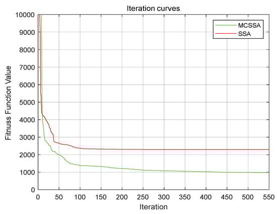 In the comparison experiment, the population is set to 50, the number of iterations is set to 600, the K value is set to 5, and the value range of the initial clustering value is [0, 100]. The iteration curve of SSA and MCSSA is shown in Figure 7.