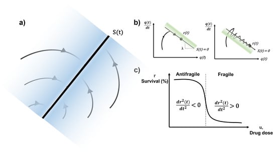 - the sliding surface does not depend on the process dynamics, but it is determined by parameters selected by the designer, as suggested in deCarlo et al. [33], i.e., desired trajectory of the system in the antifragile region of the drug dose–response curve (e.g., Hill function),