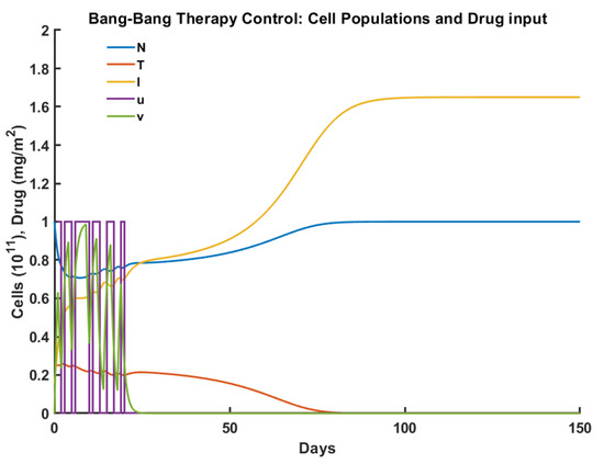 - Ledzewicz, U.; Schättler, H. Optimal bang-bang controls for a two-compartment model in cancer chemotherapy. J. Optim. Theory Appl. 2002, 114, 609–637. [Google Scholar] [CrossRef]