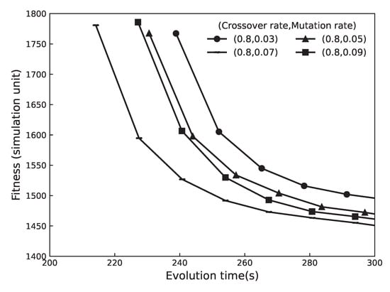 From Figure 1, it can be clearly seen that the value reduces as the evolution time increases. At the same time, it can be seen that the value is optimal when the mutation rate is 0.07. Subsequent experiments in this paper were carried out in an environment with a mutation rate of 0.07.