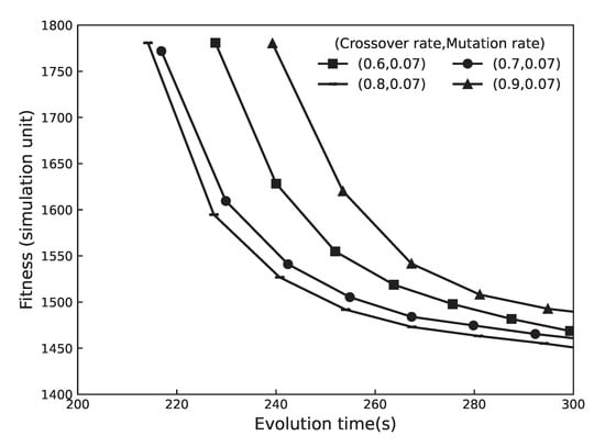 In the next step, a mutation rate of 0.07 is chosen. The number of variant genes was 1, and the crossover rates were 0.6, 0.7, 0.8 and 0.9 for the comparison experiments. The results are shown in Figure 2.
