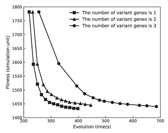 Figure 3 clearly shows that the value decreases with the increase of evolution time. It is also evident that when the number of mutant genes is 1, the value is optimal. Subsequent experiments in this paper were carried out in an environment where the crossover rate was set to 1.