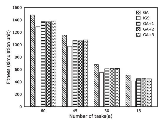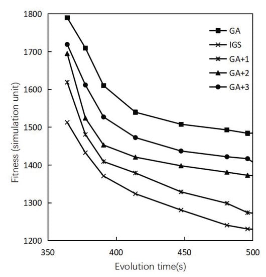 As can be seen from Figure 5, the values of IGS algorithm and GA [20,40], GA+1 [20,40], GA+2 [21,38], GA+3 [22,37] algorithm are optimized for the initial population, and the evolution starts in 200s and ends in 350s. Moreover, although the other three algorithms started to evolve after 350s, there are great differences in the evolution time. As is shown in the experiments, under the same evolution time, the value of the GA+1 is much smaller than the GA, GA+2 and GA+3. In summary, the IGS achieves best value.
