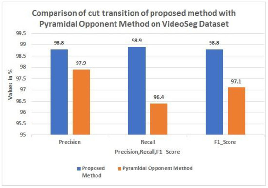 Table 4 compares the proposed method for cut transition detection on the VideoSeg Dataset to that of pyramidal opponent method [29]. The proposed method yields a high F1 score of 98.8 %, whereas [29] yields a score of 97.1%. Figure 6 depicts a graphical comparison of precision, recall, and F1 score. This demonstrates the importance of analysing the transition behaviour of video frames in the proposed method versus the bagged tree classifiers in the existing method.