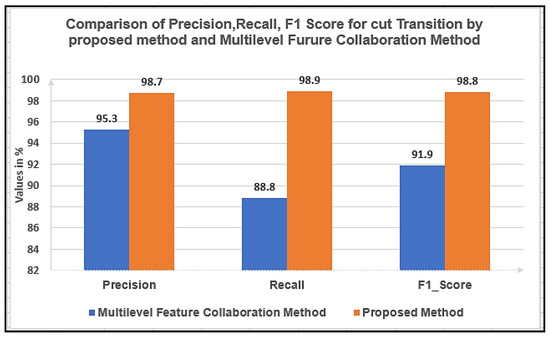 Comparison of Precision, Recall &F1 Score for Cut Transitions by proposed algorithm with Multilevel Feature Collaboration Method