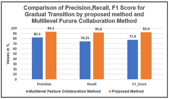 Comparison of Precision, Recall &F1 Score for gradual transitions by proposed algorithm with Multilevel Feature Collaboration Method
